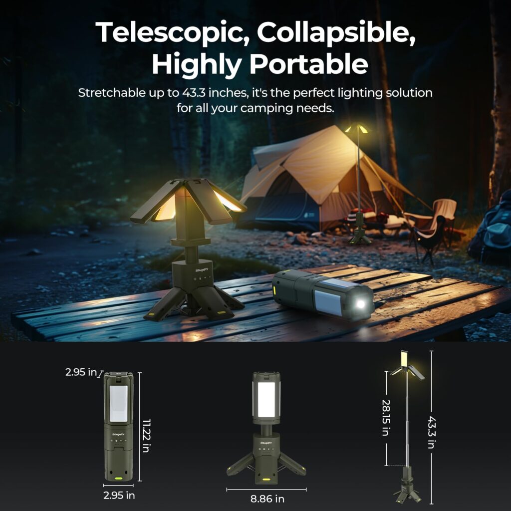 This device is not just a camping light; it also serves as a Bluetooth speaker and a power bank for recharging your electronics. The light’s telescopic pole extends up to 40 inches, providing a higher reach to brighten your campsite more effectively. Plus, the lamp head can be rotated 180 degrees to direct light precisely where it’s needed.